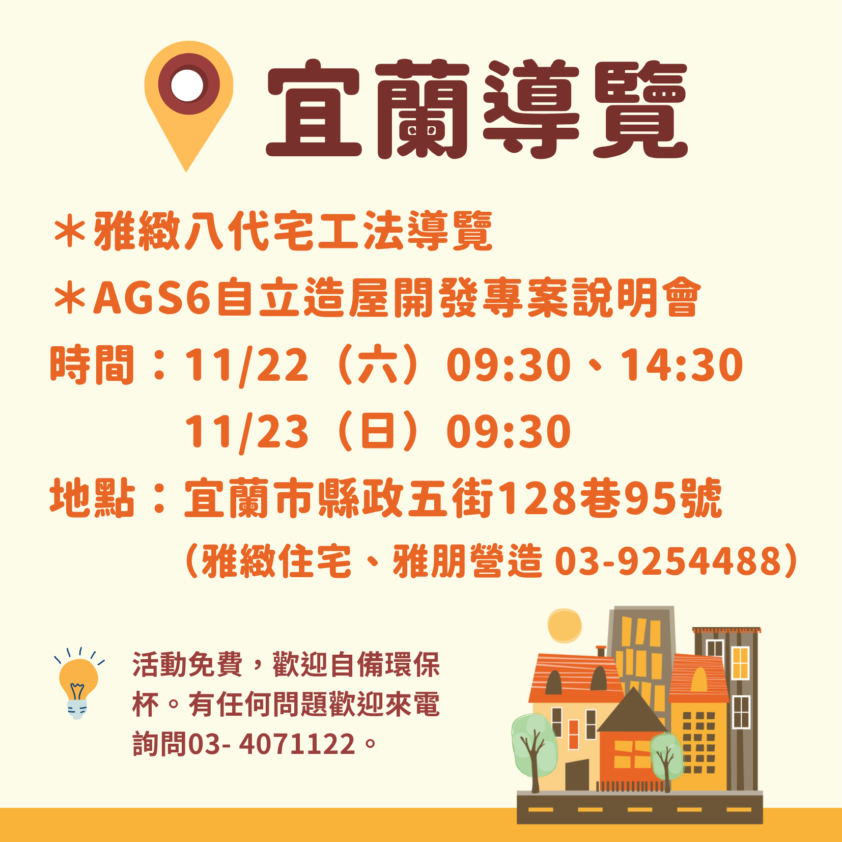 1. 宜蘭場:11/01(六)、11/08(六)下午場;11/02(日)、11/09(日)上午場